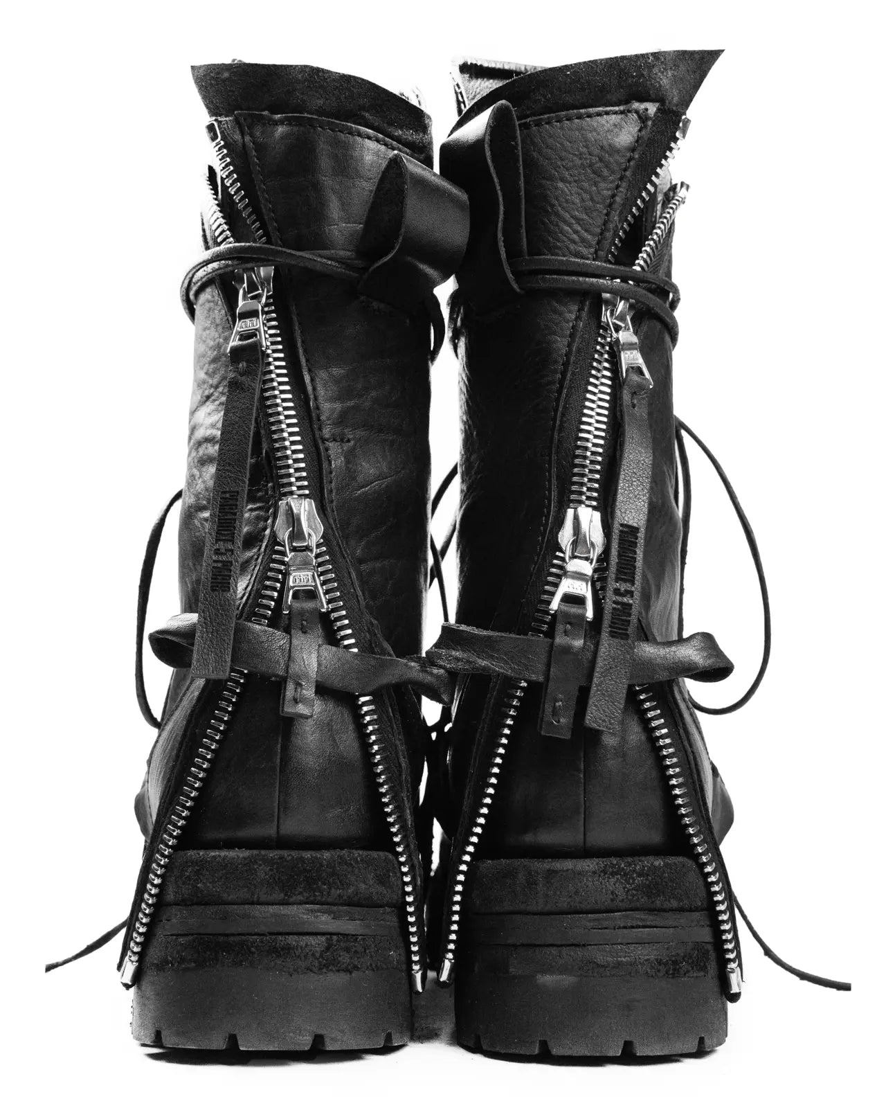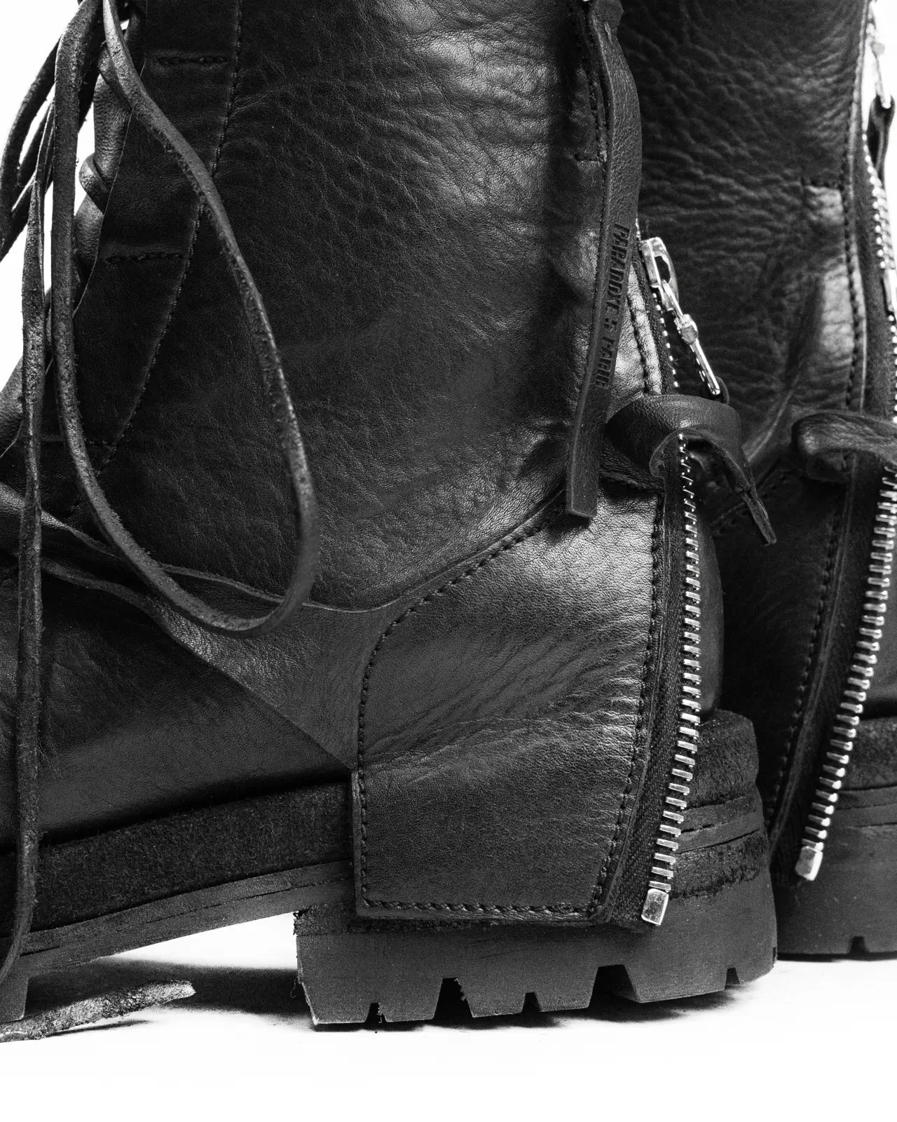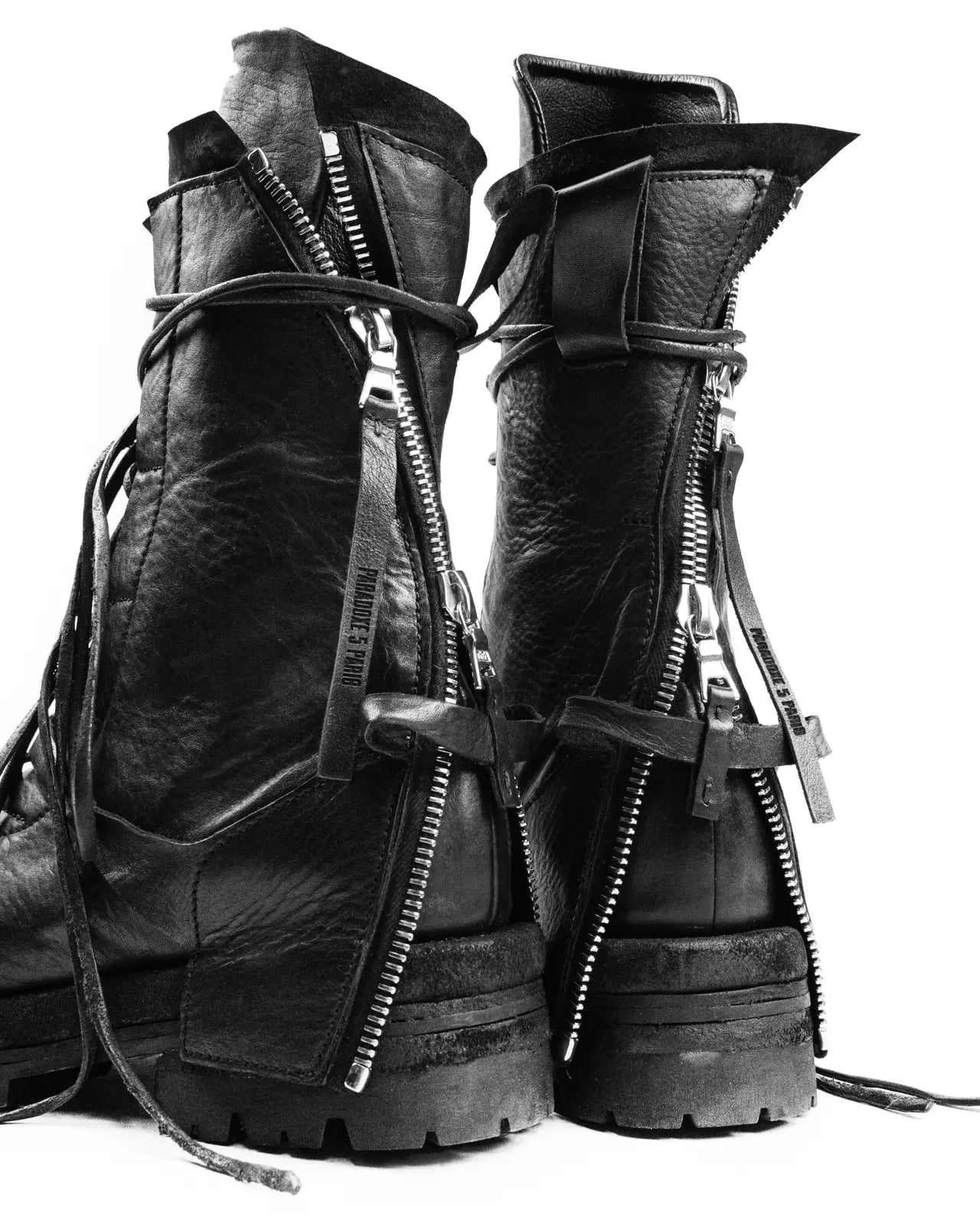 Handcrafted in France, the FRACTURE LEATHER COMBAT BOOTS embodies exceptional artisanship and the finest materials. Made from supple, high-quality full-grain cowhide sourced from renowned Italian tanneries, it offers both elegance and durability. A lambskin leather lining ensures ultimate comfort, while the Vibram sole provides unmatched lightness and resilience. Featuring a double RIRI M8 zipper with a leather pull tab and refined leather laces, every detail reflects timeless sophistication. A statement piece designed to elevate every step.