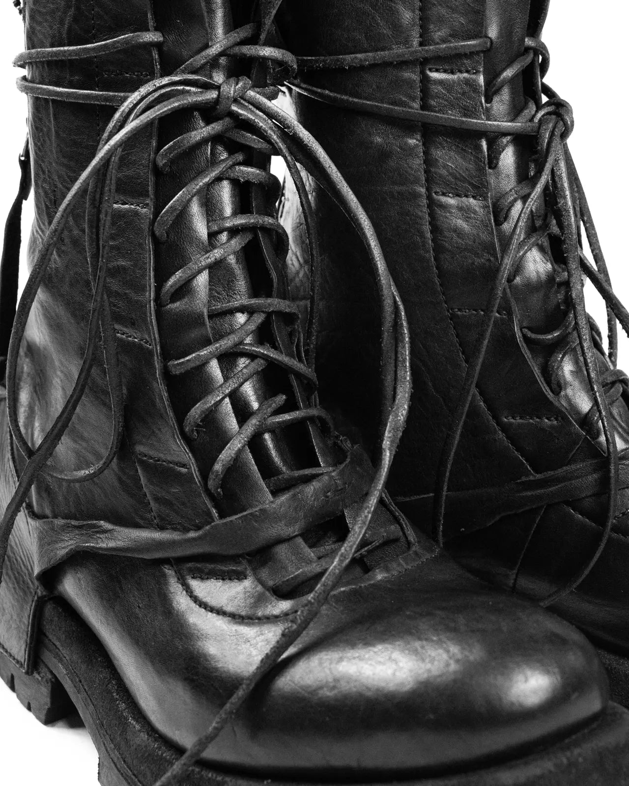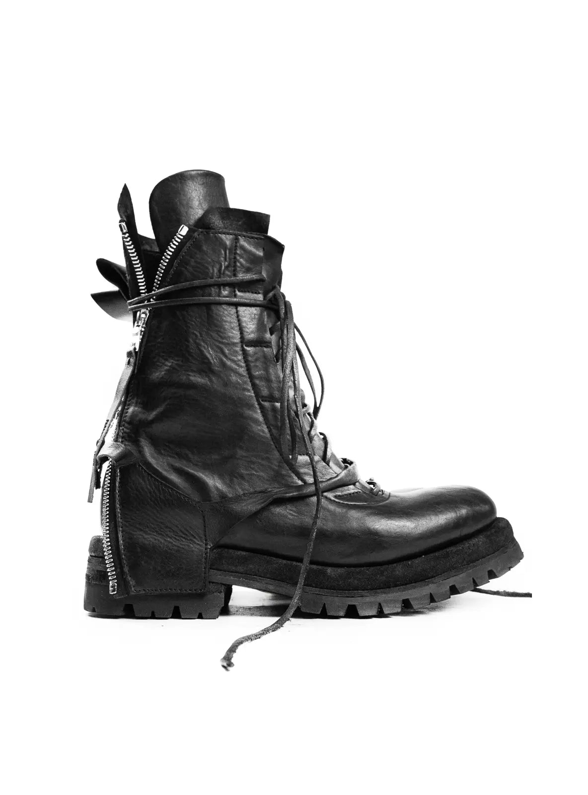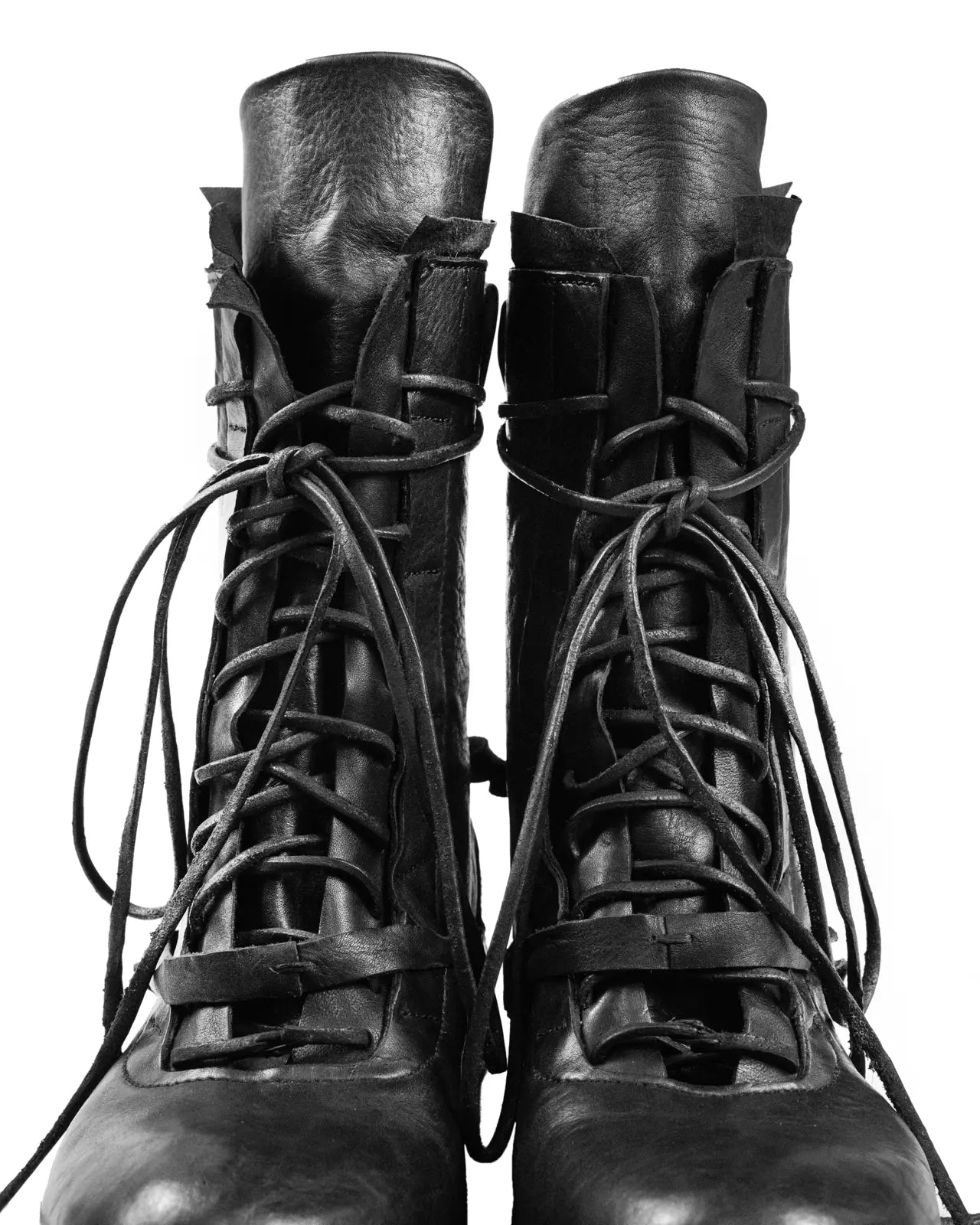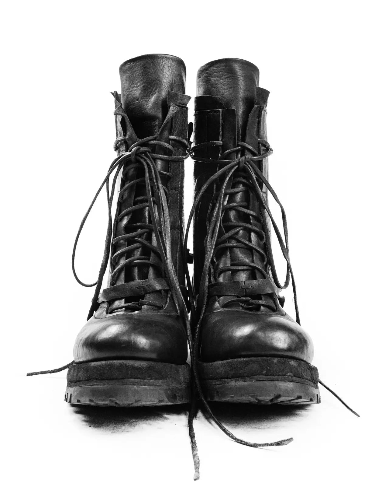 Handcrafted in France, the FRACTURE LEATHER COMBAT BOOTS embodies exceptional artisanship and the finest materials. Made from supple, high-quality full-grain cowhide sourced from renowned Italian tanneries, it offers both elegance and durability. A lambskin leather lining ensures ultimate comfort, while the Vibram sole provides unmatched lightness and resilience. Featuring a double RIRI M8 zipper with a leather pull tab and refined leather laces, every detail reflects timeless sophistication. A statement piece designed to elevate every step.