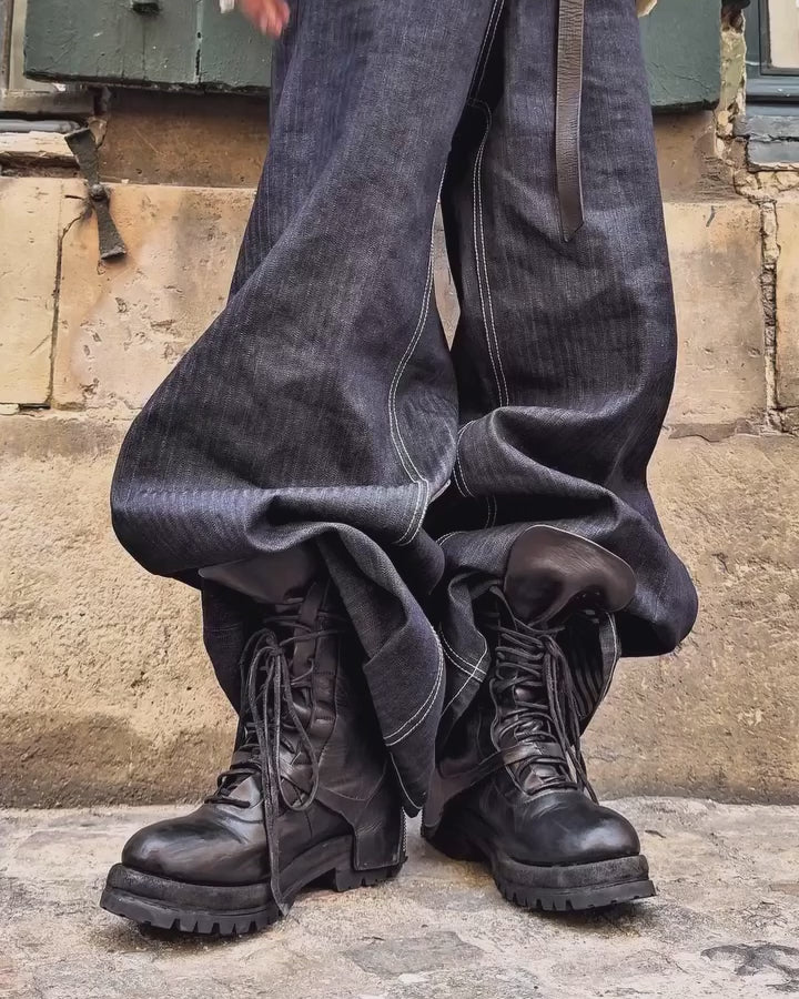 This avant-garde interpretation of our Big Baggy cut is crafted from 100% cotton blue denim, restructured by a series of vertical linear stripes, creating a sense of movement, flow, and controlled rhythm. The oversized shape, raw hems, and intentionally exposed edges give the piece its dark, radical character.