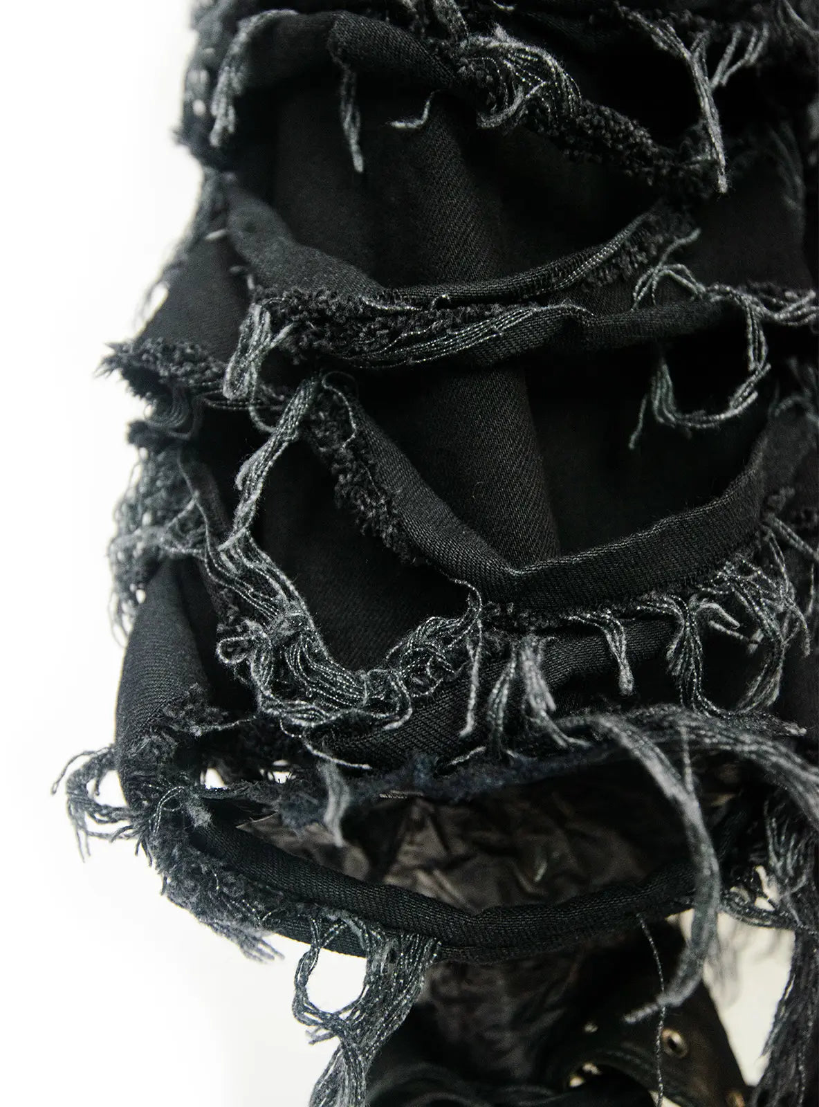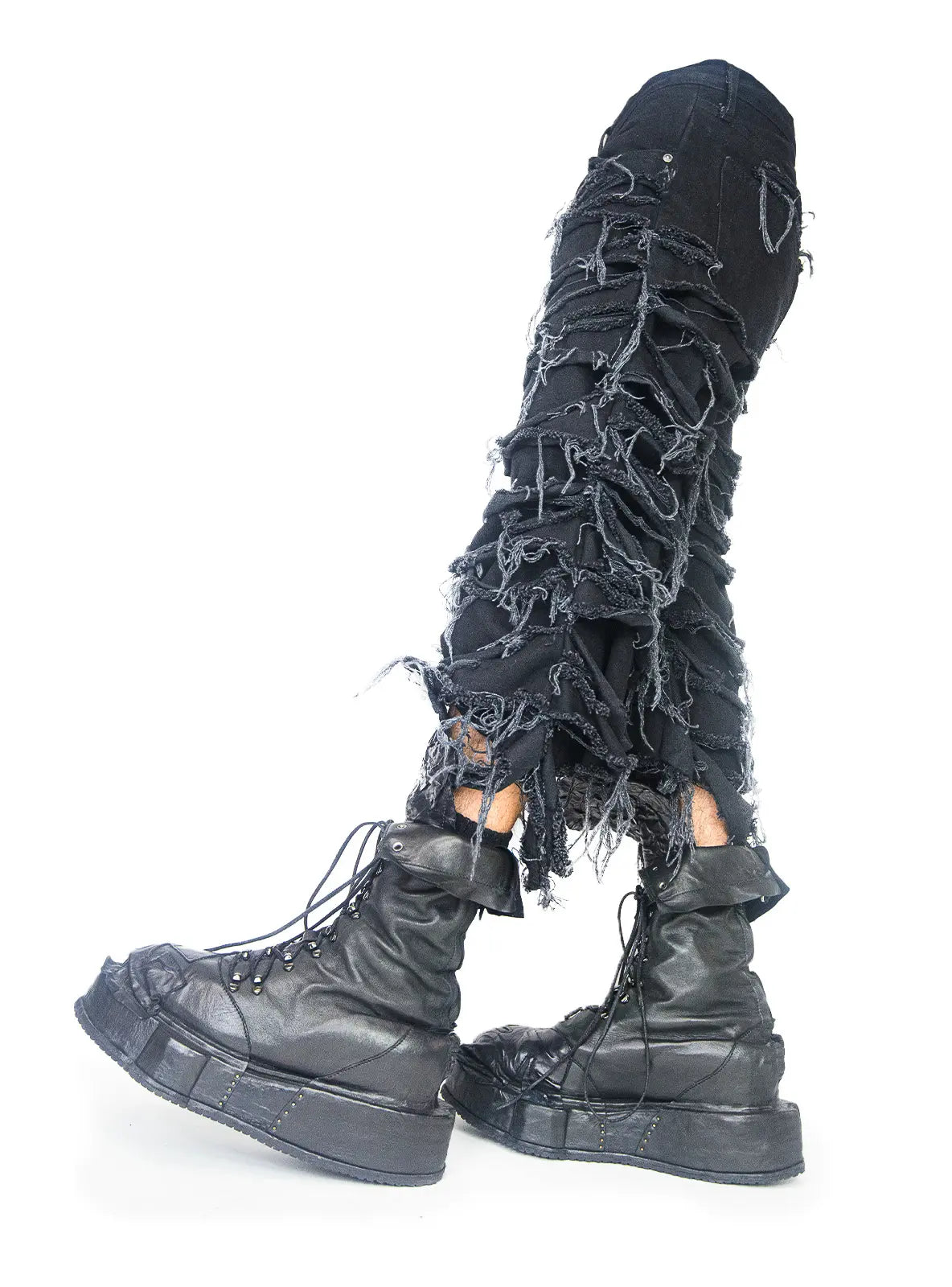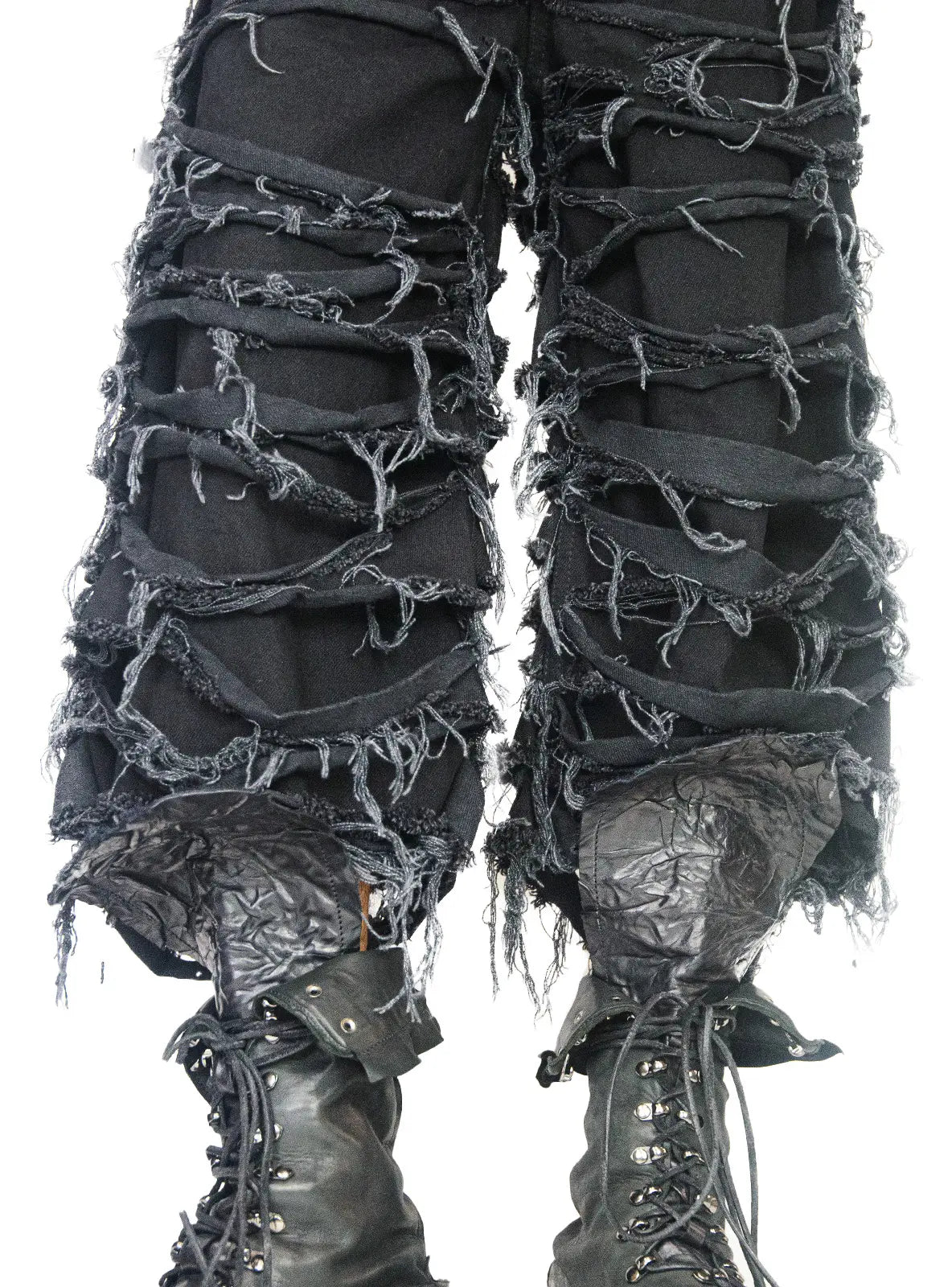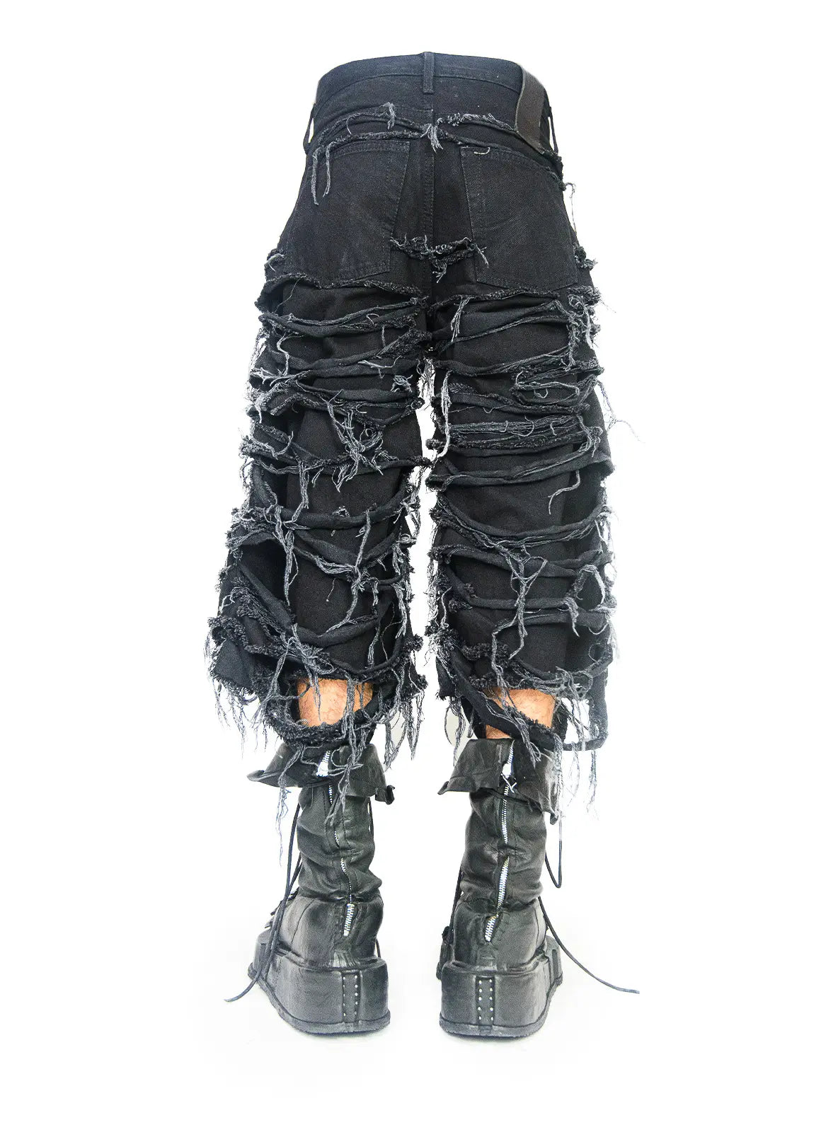 The Reaper Shorts Baggy Black Denim is a stylish and comfortable piece made from black denim, characterized by its textured, torn appearance. The jeans boast a straight, wide cut, and despite their rough exterior, they are soft to the touch. Designed and crafted entirely in our Parisian atelier, each pair of Reaper Shorts Baggy Black Denim is one-of-a-kind, featuring unique rips and detailing.