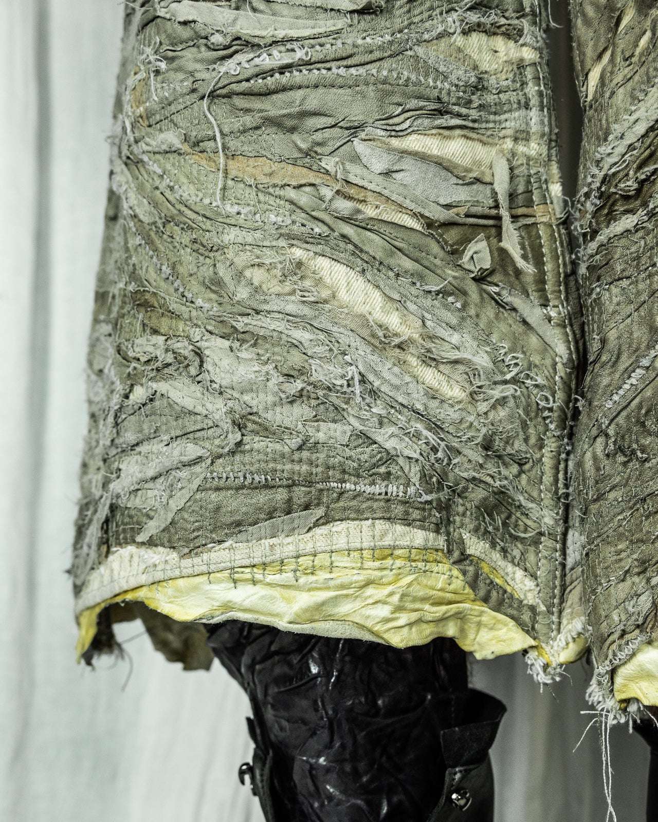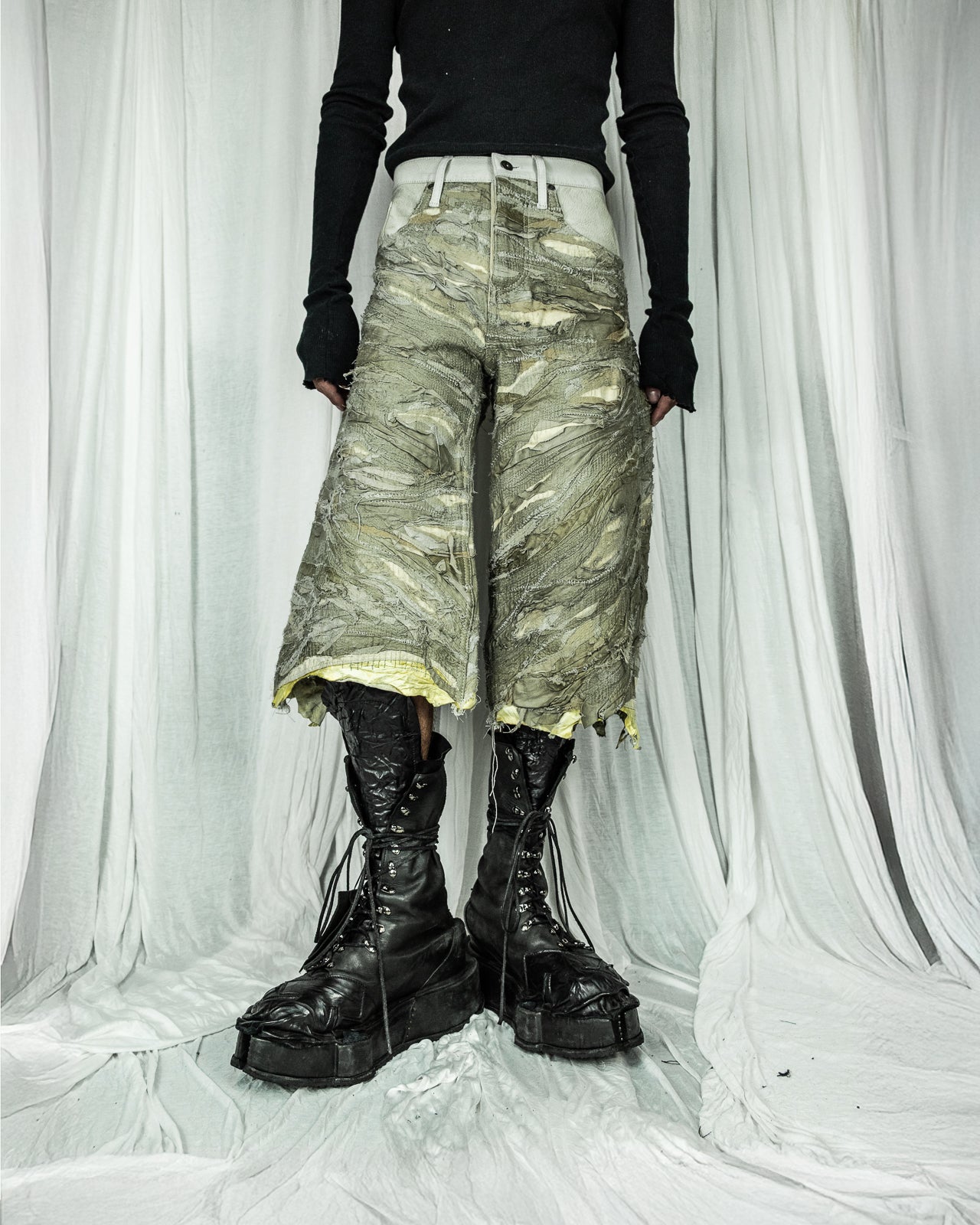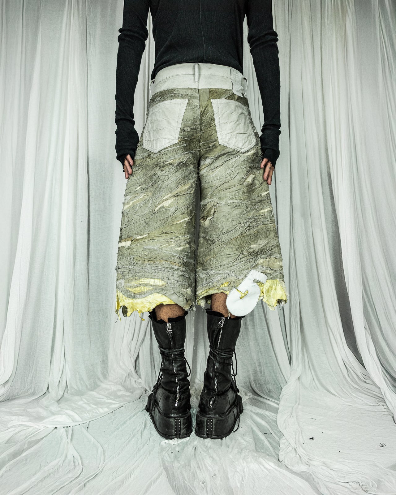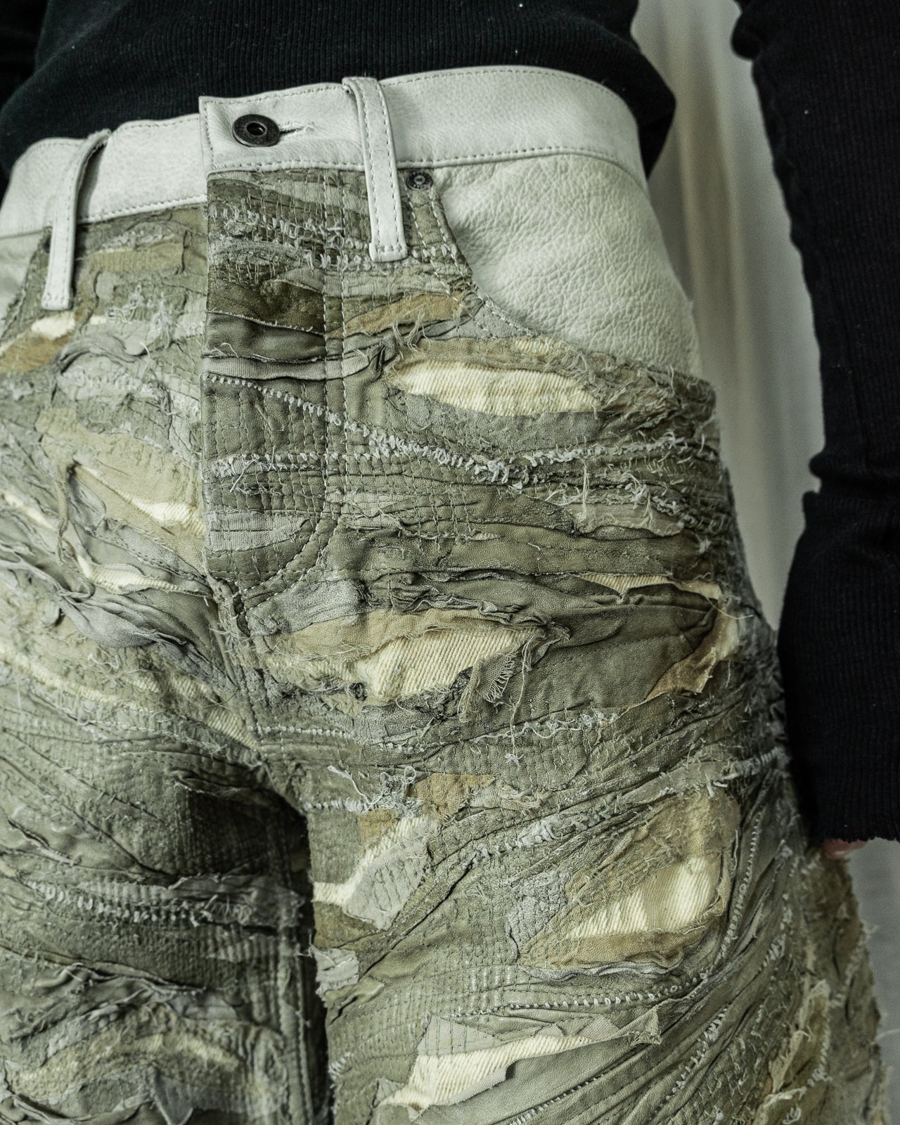 LAYERED LEATHER SHORTS BAGGY KHAKI DENIM