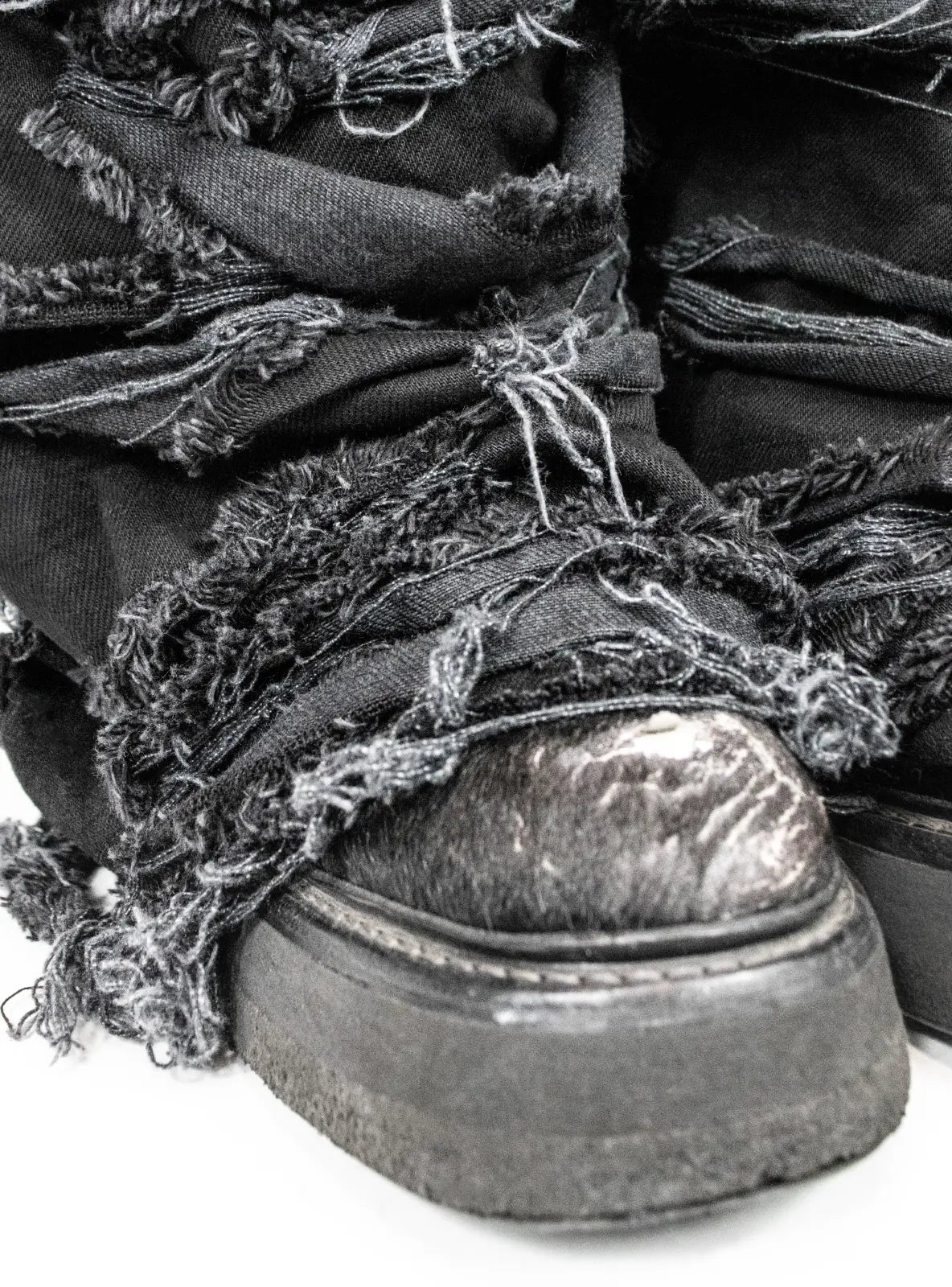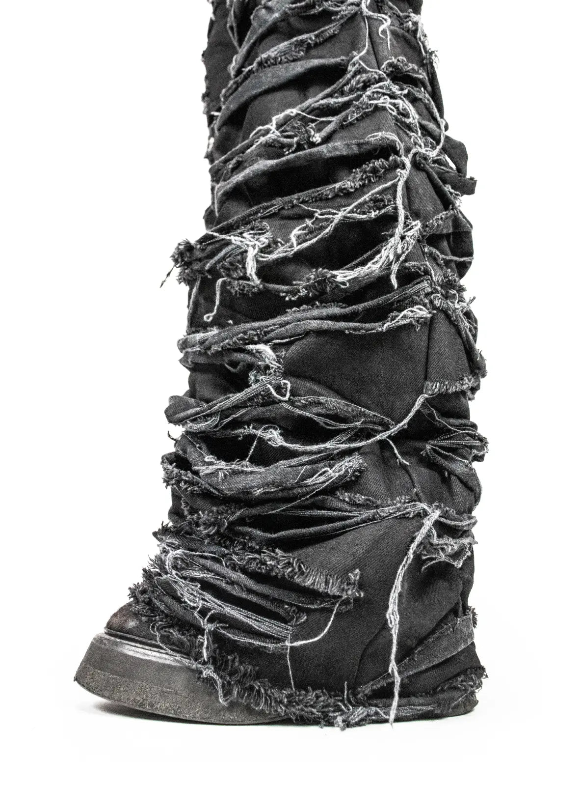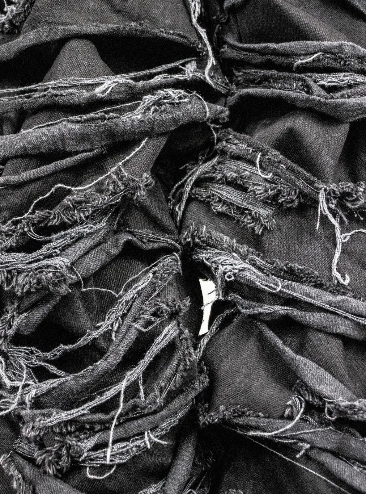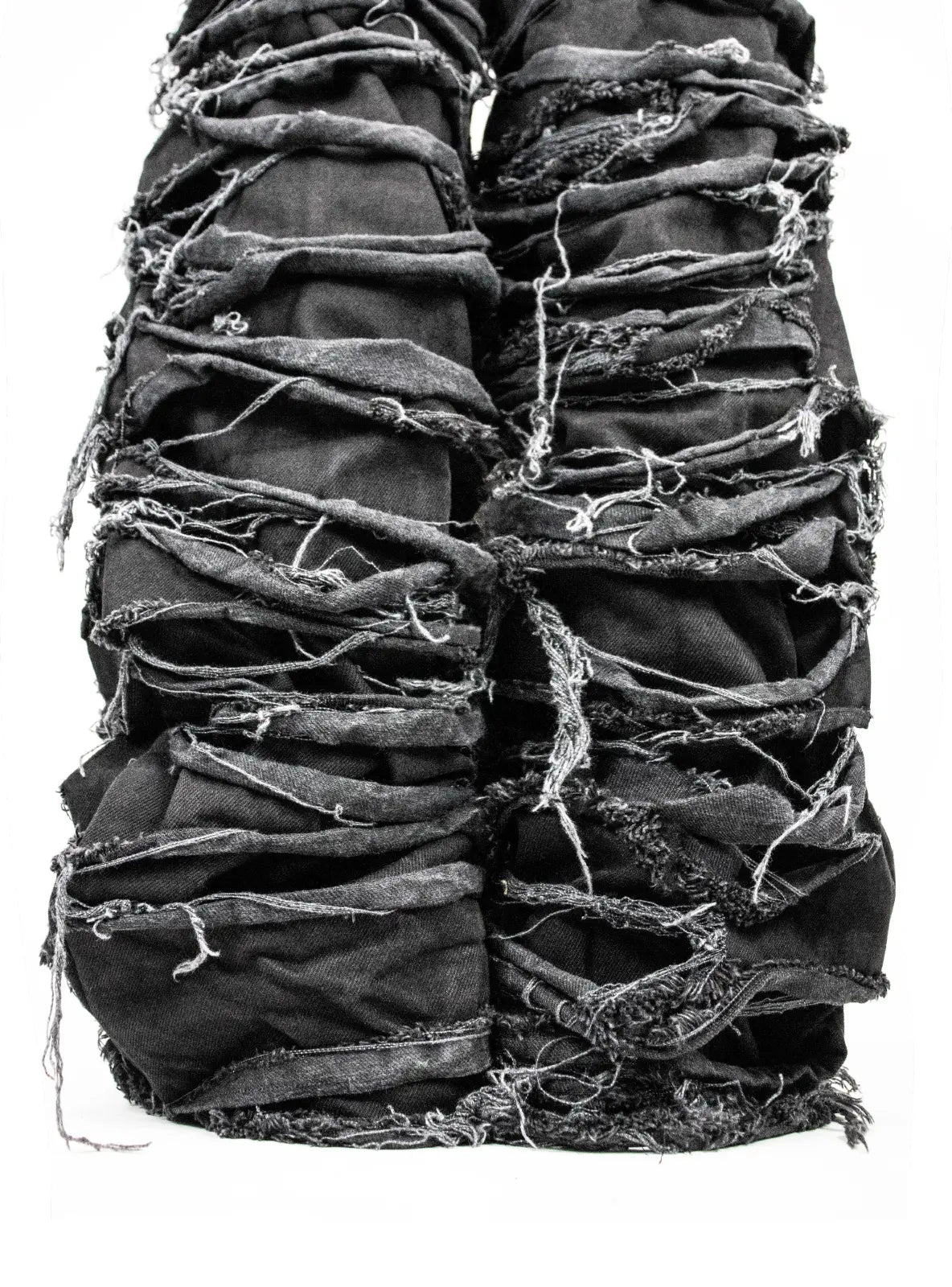 The Reaper Jeans Baggy Black Denim is a stylish and comfortable piece made from black denim, characterized by its textured, torn appearance. The jeans boast a straight, wide cut, and despite their rough exterior, they are soft to the touch. Designed and crafted entirely in our Parisian atelier, each pair of Reaper Jeans Baggy Black Denim is one-of-a-kind, featuring unique rips and detailing.